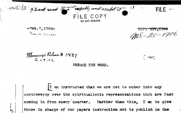 This document contains two of the most important statements on the Holy Spirit from the writings of Ellen White. They appear at the end of the document. Of special significance is a line at the top of the manuscript in the handwriting of Ellen White: "I have read this carefully and accept it." The key paragraphs come at the end of the document which was written as a manuscript cautioning against writing or preaching on spiritualism.
